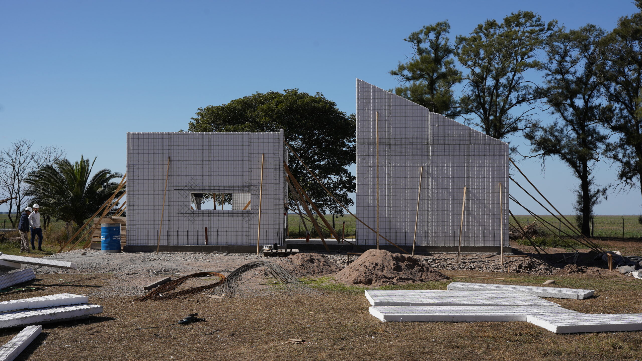 Sobre una platea de fundación construida en hormigón armado se montan los paneles EPS mediante hierros de sujeción, vinculando los paneles entre sí y con la platea.